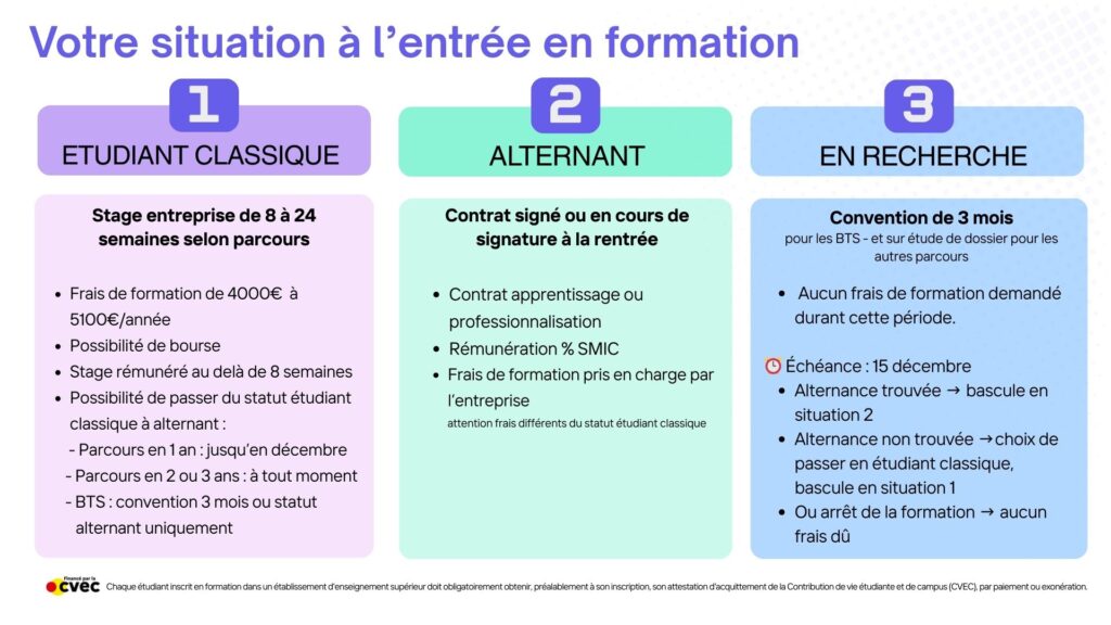 Suite à son admission au sein d’un cursus de Bachelor ou Bac+5, l’étudiant a le choix entre le statut d’étudiant (formation initiale) ou d’alternant (étudiant-apprenti ou salarié en contrat de professionnalisation).